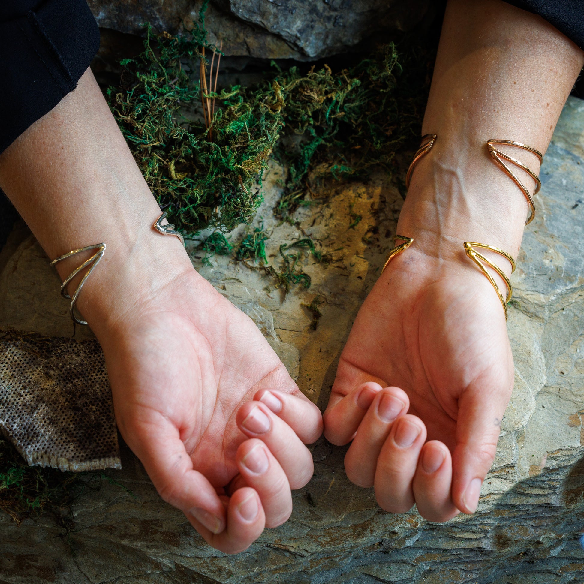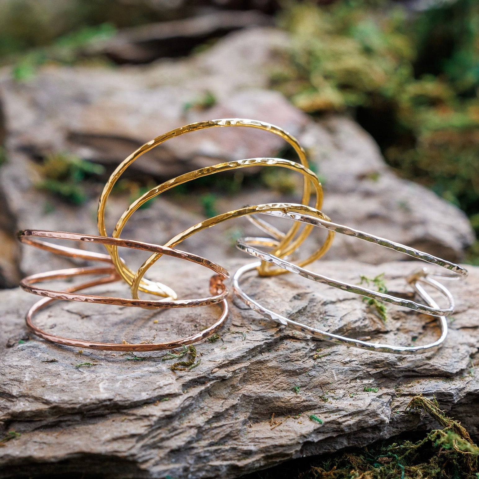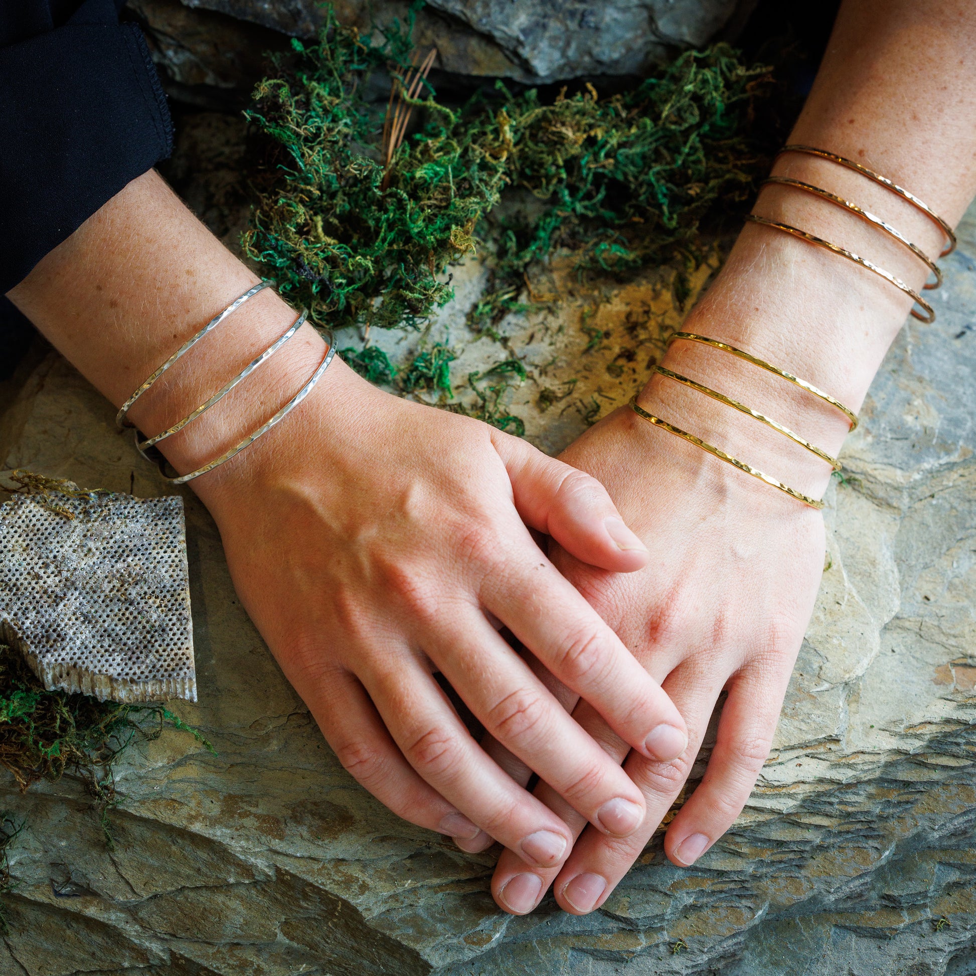 The 3 Strand Glitter Cuff is delicate yet substantial. Shana’s hammering technique give the piece it’s sparkling glitter effect. A favorite!