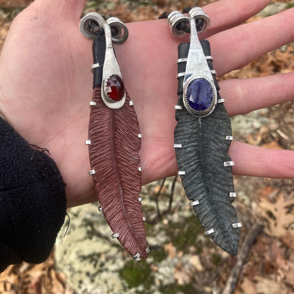 Red Stone - Catlinite: Sacred Pipestone. May only be legally mined by card carrying Native Americans. (Hessonite Garnet set to honor the feather)