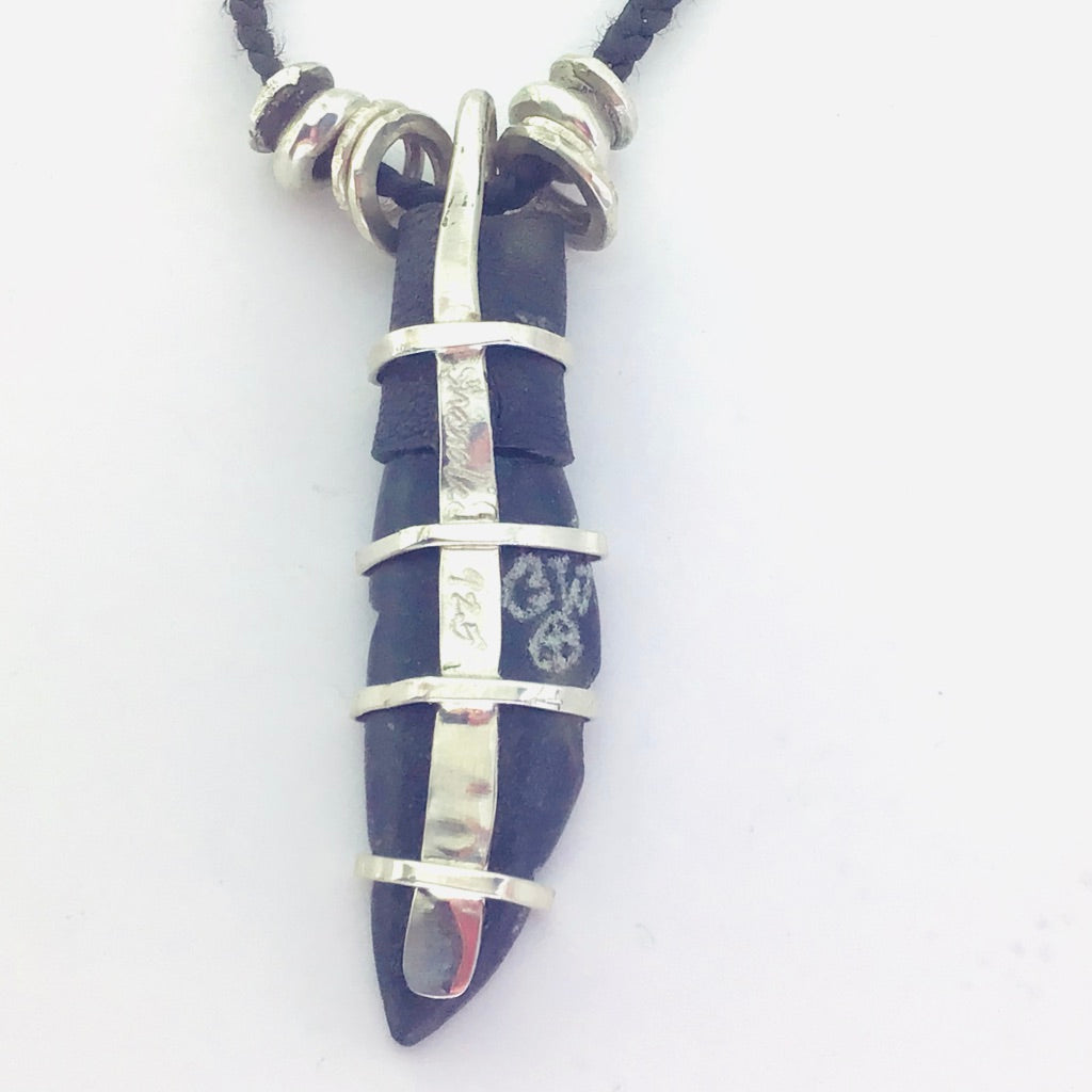 These feathers are hand-carved by Guardian Wolf and his wife Little Wing (Cherokee, Hiltons, VA). Guardian Wolf is a stone carver of sacred and ceremonial objects. His work can be found in the Smithsonian, in Native American textbooks, and one of his pipes was used at the Meeting of The Seven Nations.