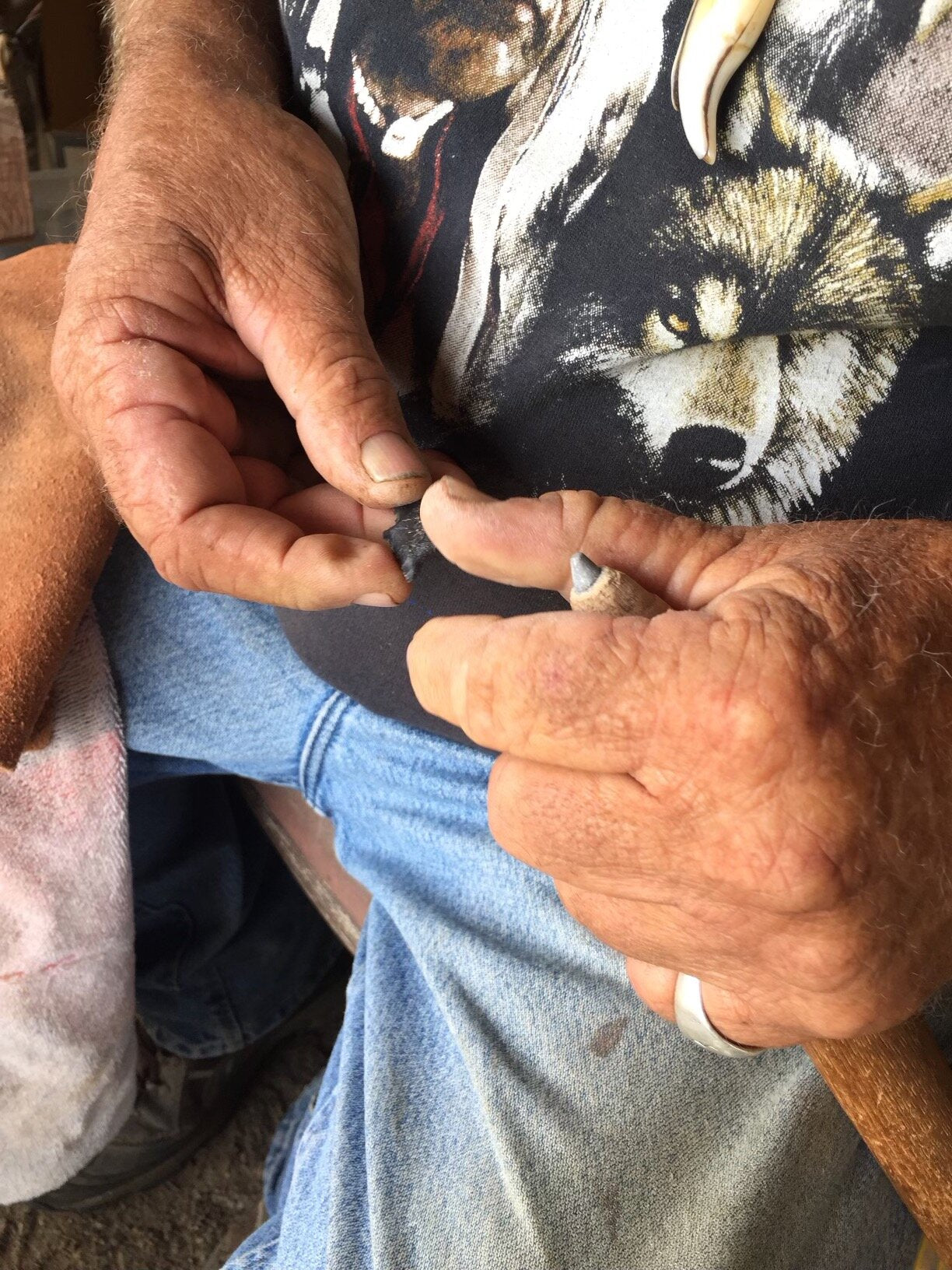 Flint arrowheads are hand-knapped by Guardian Wolf, Cherokee, Hiltons, VA. He also collects the flint himself from a lake near his house "when it's low enough" which is only a few times a year.