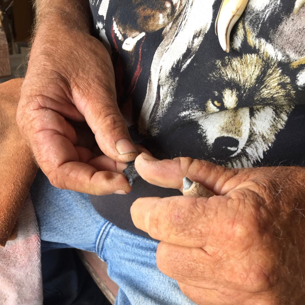 Flint arrowheads are hand-knapped by Guardian Wolf, Cherokee, Hiltons, VA. He also collects the flint himself from a lake near his house "when it's low enough" which is only a few times a year.