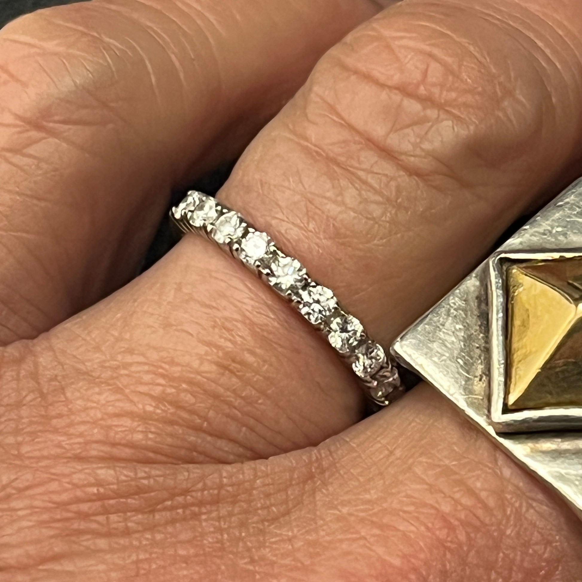 This classic diamond ring is extremely sparkly and the diamonds appear to float on the finger. The first “floating Diamonds” ring was a custom order. Shana loved it so much she kept making it. It is natural 14K White Gold (not rhodium plated). This has a very subtle warm tone which makes these fine diamonds stand out even more.