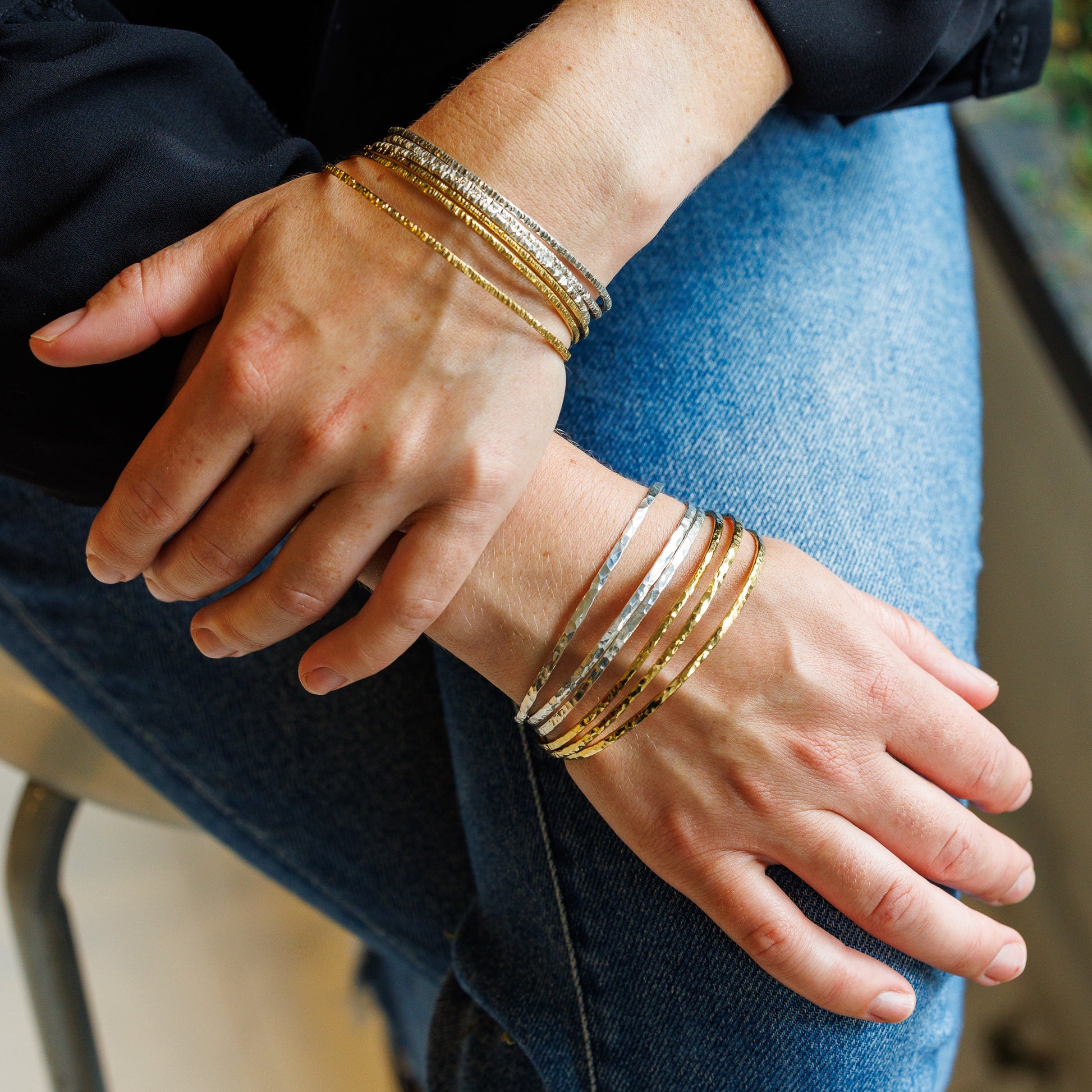 Our classic light-weight bangle with a bit of extra texture. They feel and sound heavenly. A joy to wear every day.