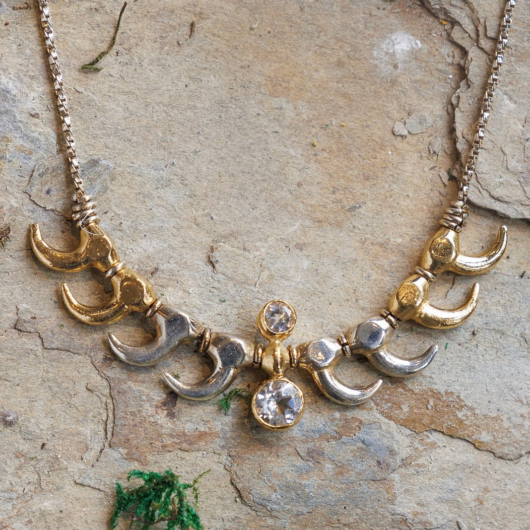 Shana sees the larger white topaz as a planet and the smaller white topaz as it’s moon and the 8 legs of the weaver going out in both directions. This necklace sits in the North Cardinal Direction: Above (The Creator)