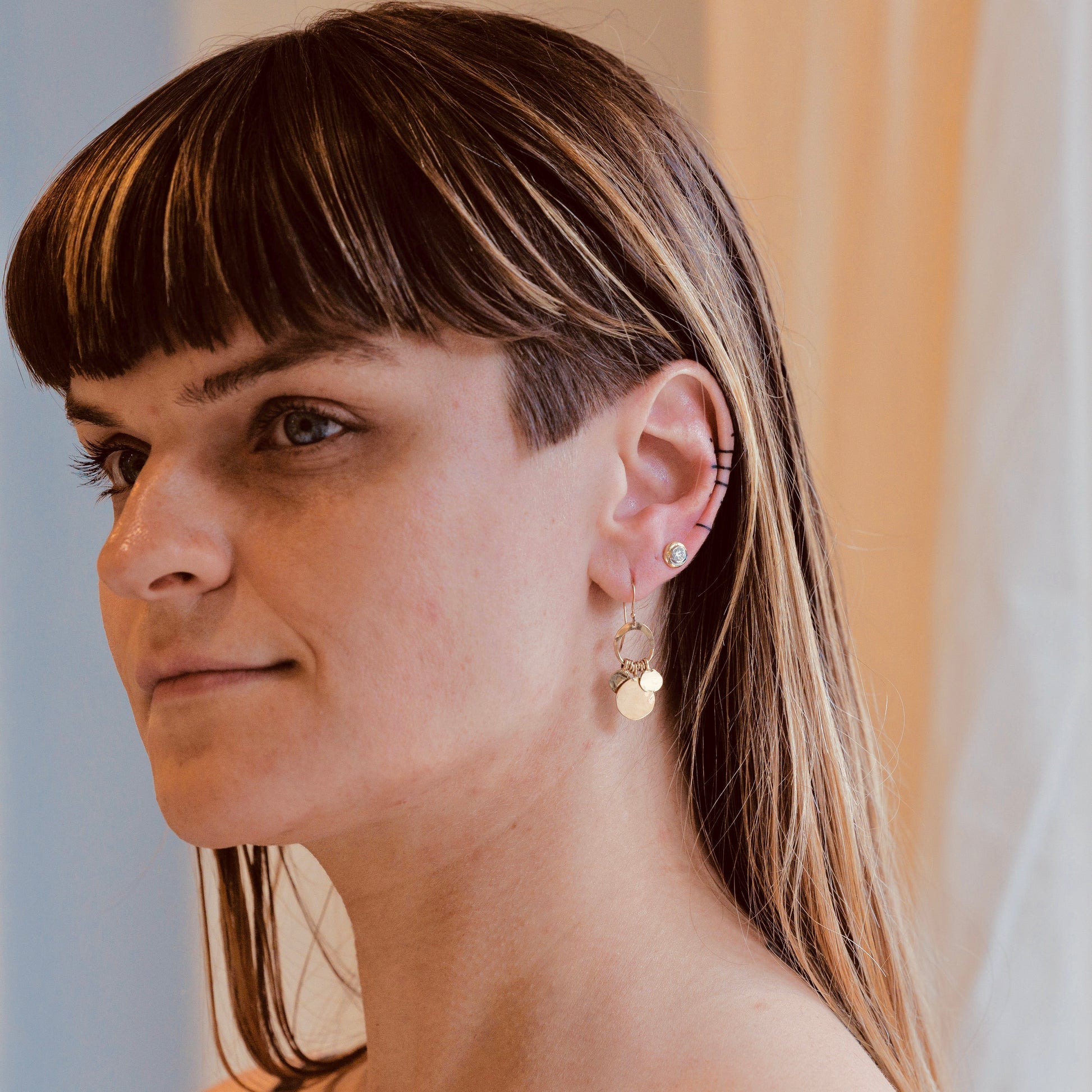 The Hammered Drop Charms are playful, delicate, and charming. Each hand forged disc sits separated by handmade rings on a small flat circle for independent movement of each delicate piece. These beautifully crafted earrings brighten up any wardrobe.