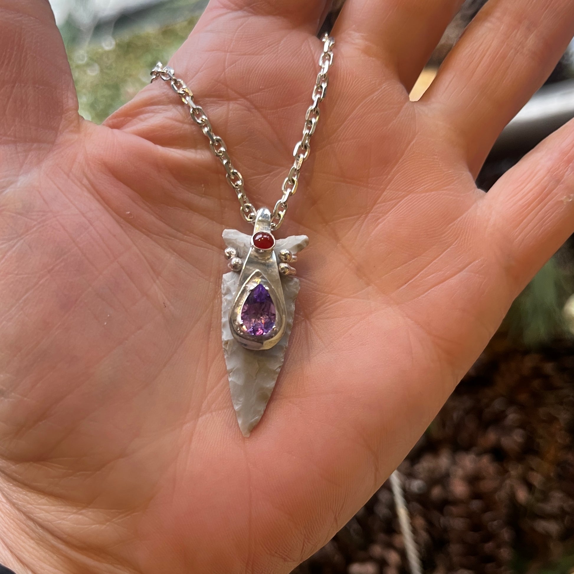 This grey flint arrowhead is with prong set faceted pear shaped Amethyst & small bezel set cabochon carnelian. Shana's uncle, Guardian Wolf (Cherokee, Wolf Clan) knapped this arrowhead. Every arrowhead is a protection piece