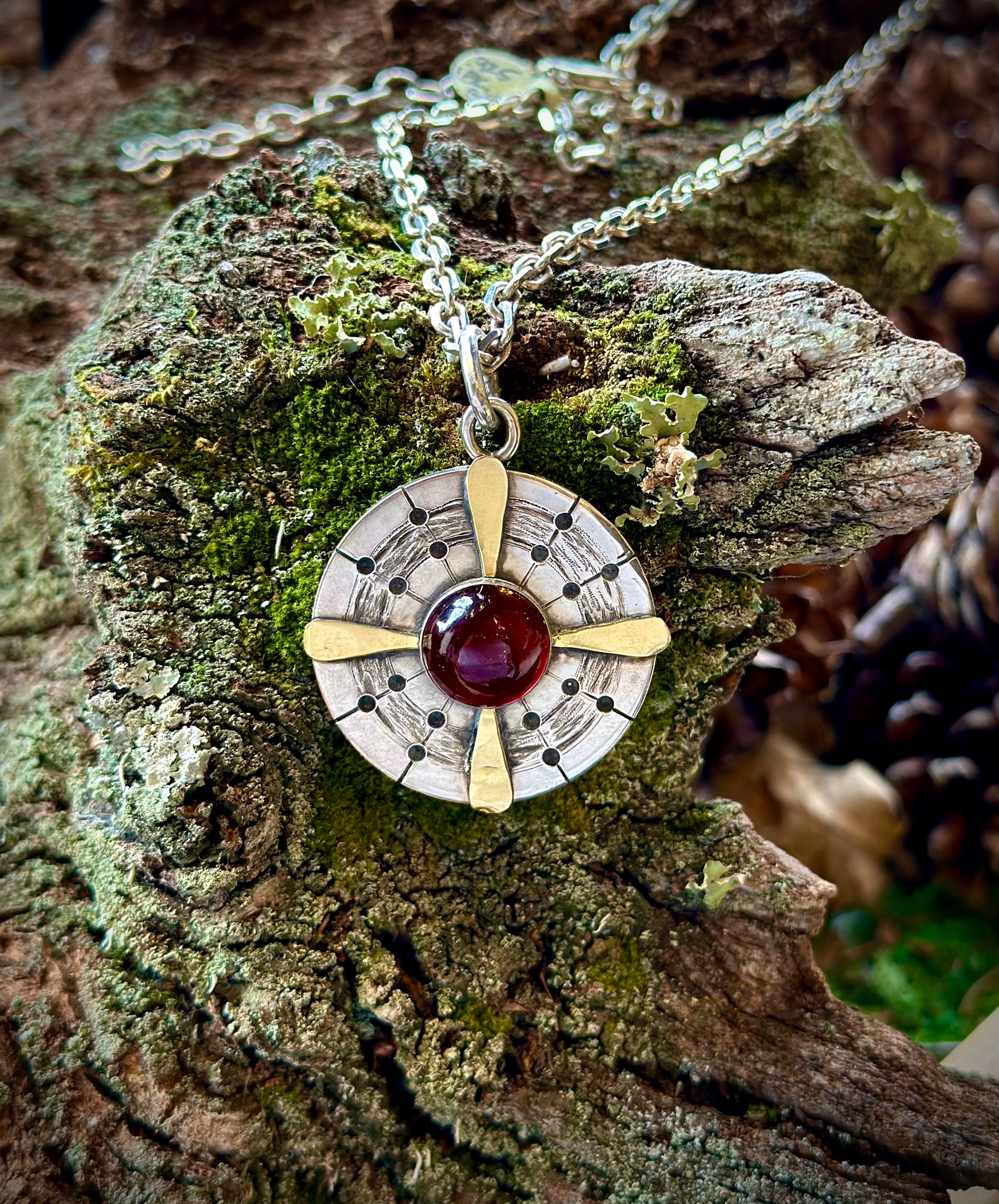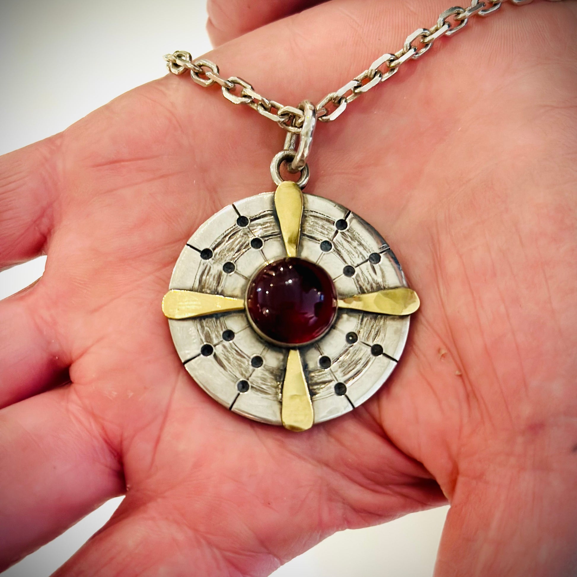 This robust medallion of solid sterling silver is adorned with 18k gold loves me petals and a large central cabochon garnet. It hangs on a substantial 22” chain.