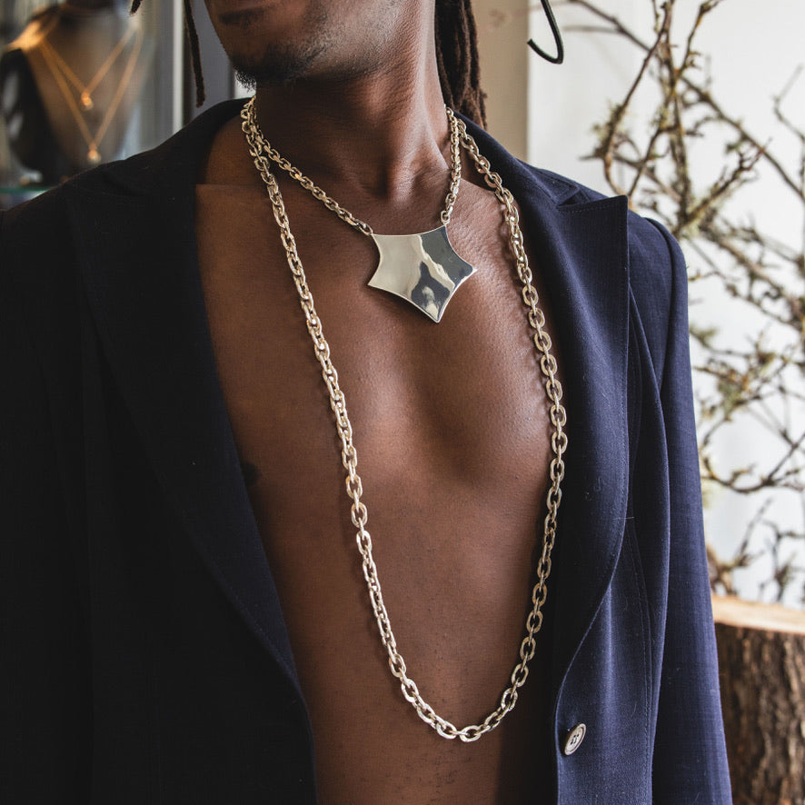 Each of the links in our “Lynx” chain are hand made. Taking up to two months to make each chain, these pieces are a testament to Shana’s dedication and craftsmanship. The specially made clasp can link at any point on the 40” Sterling silver chain, making it very versatile. Wear it doubled, as a lariat, or as a long single loop chain.