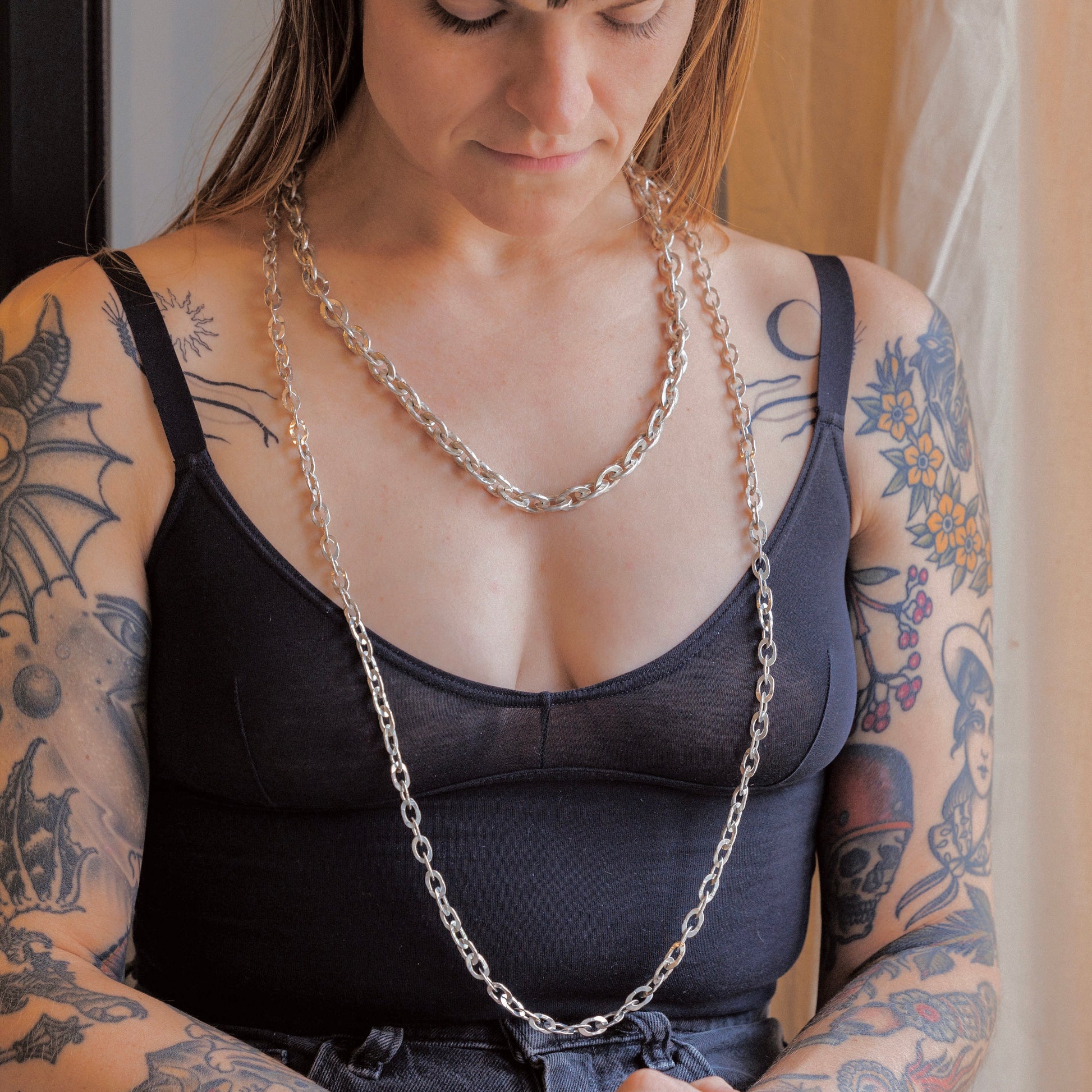 Model wearing Lynx light - Long and Heavy short so you can see the difference in heft of chain.