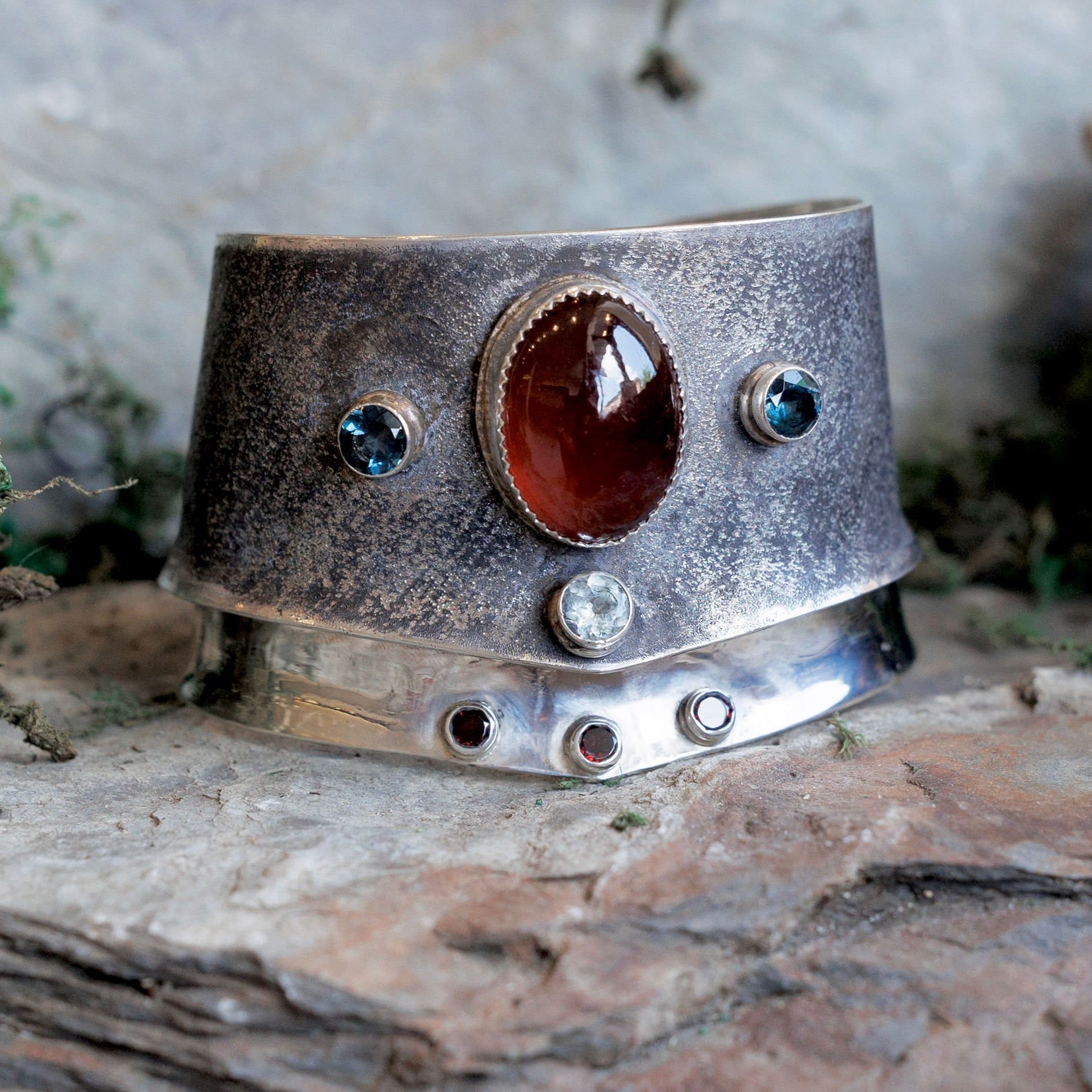 You will feel like royalty wearing our “North Cuff”. The sterling silver textured oxidized top layer against the smooth shine of the bottom layer gives this piece an ancient feel. Made with A large oval hessonite garnet, london blue topaz, sky blue topaz, and three small garnets this cuff bracelet this bracelet promotes resilience and self confidence.