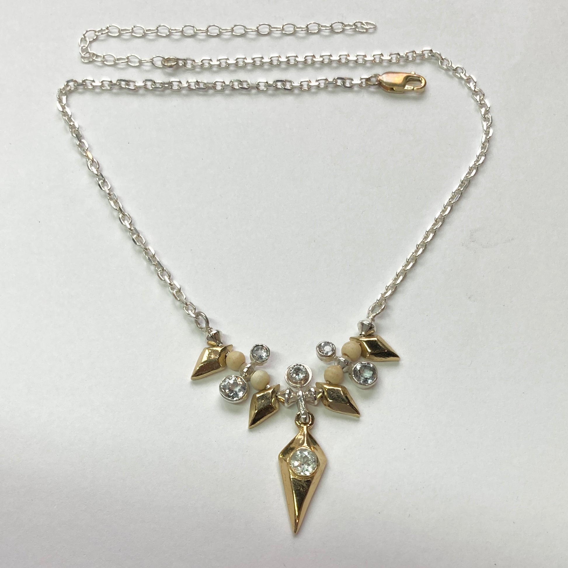 It is a mix of handmade beads, settings, and faceted White Topaz. These are strong pieces. They are spiritual pieces. They are talisman, everyday pieces. They are gorgeous and strong. Enough said.