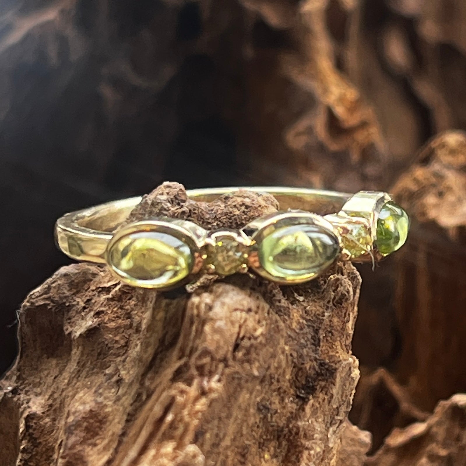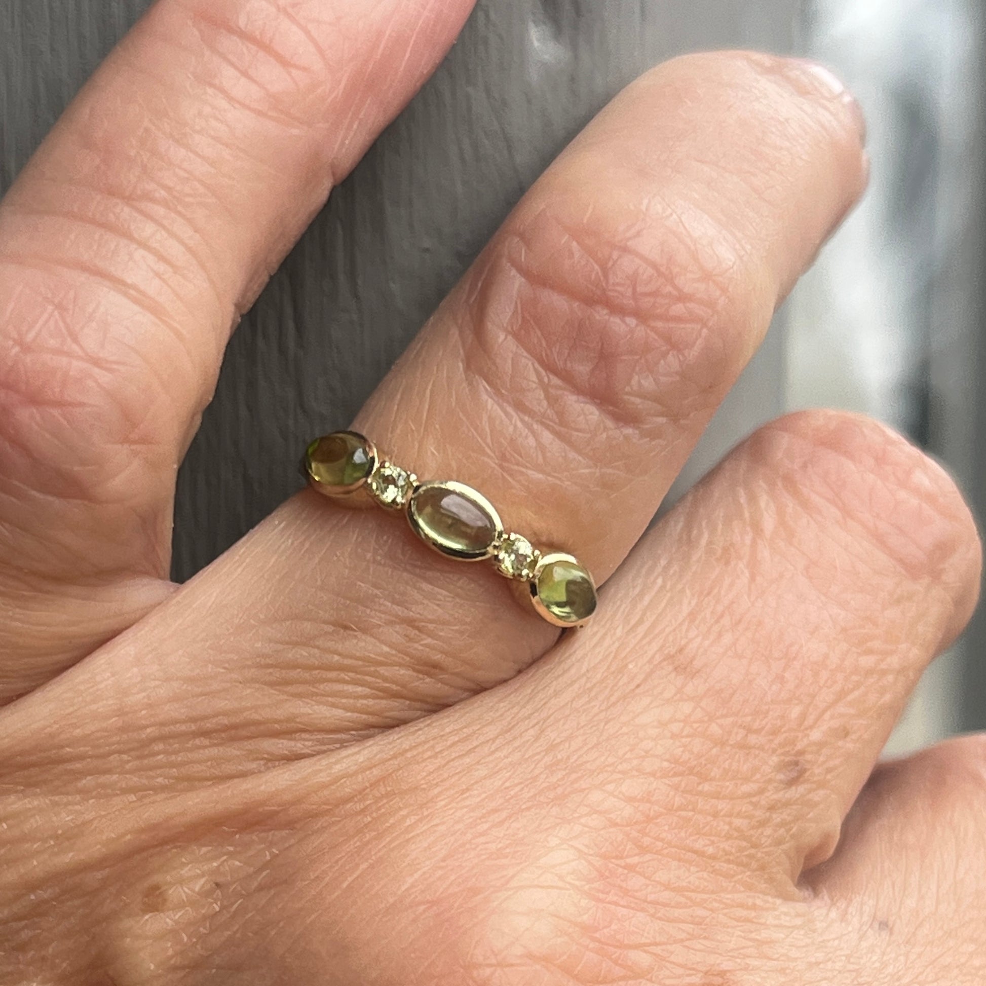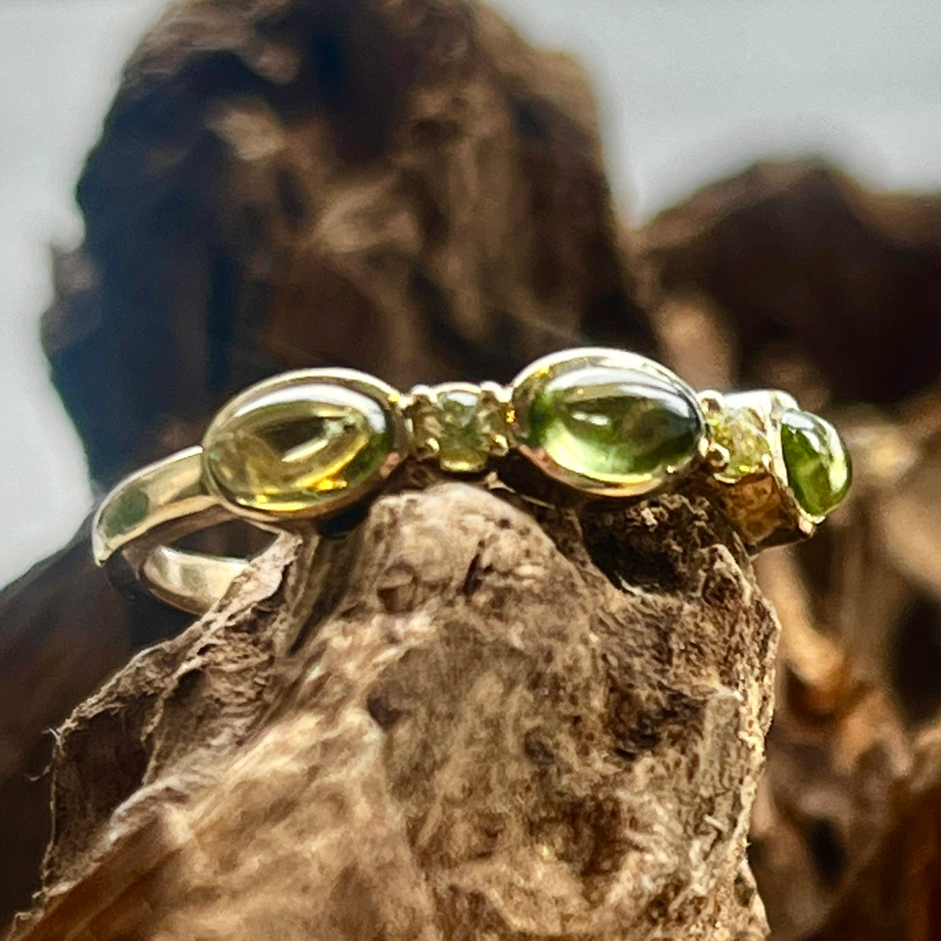 These oval cabochon peridots have little sparkly faceted round peridots between. This ring makes us think of crossing a creek gently and seeing the sparkling moving water between the stepping stones. This ring is a gentle, easy going, understated & quiet ring.