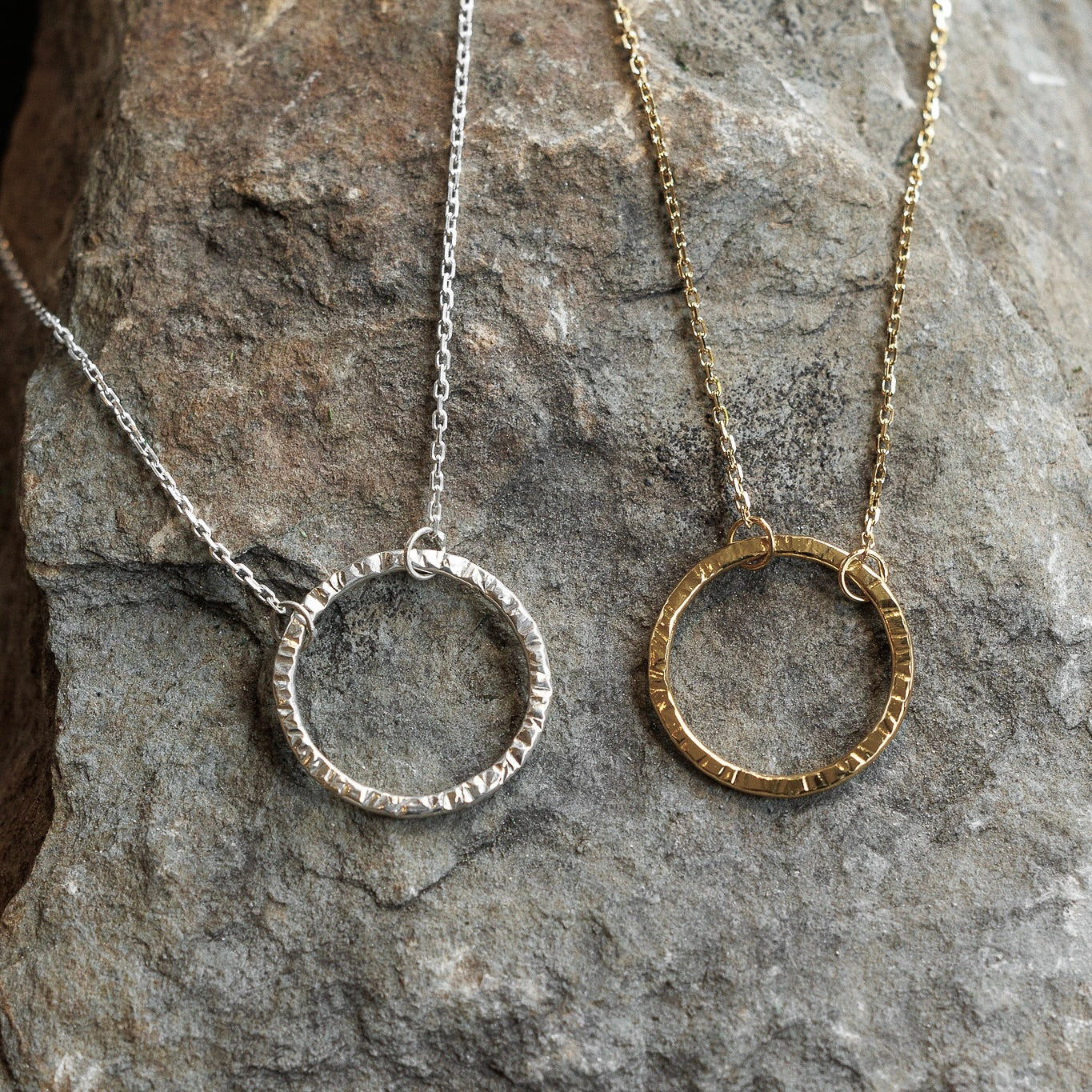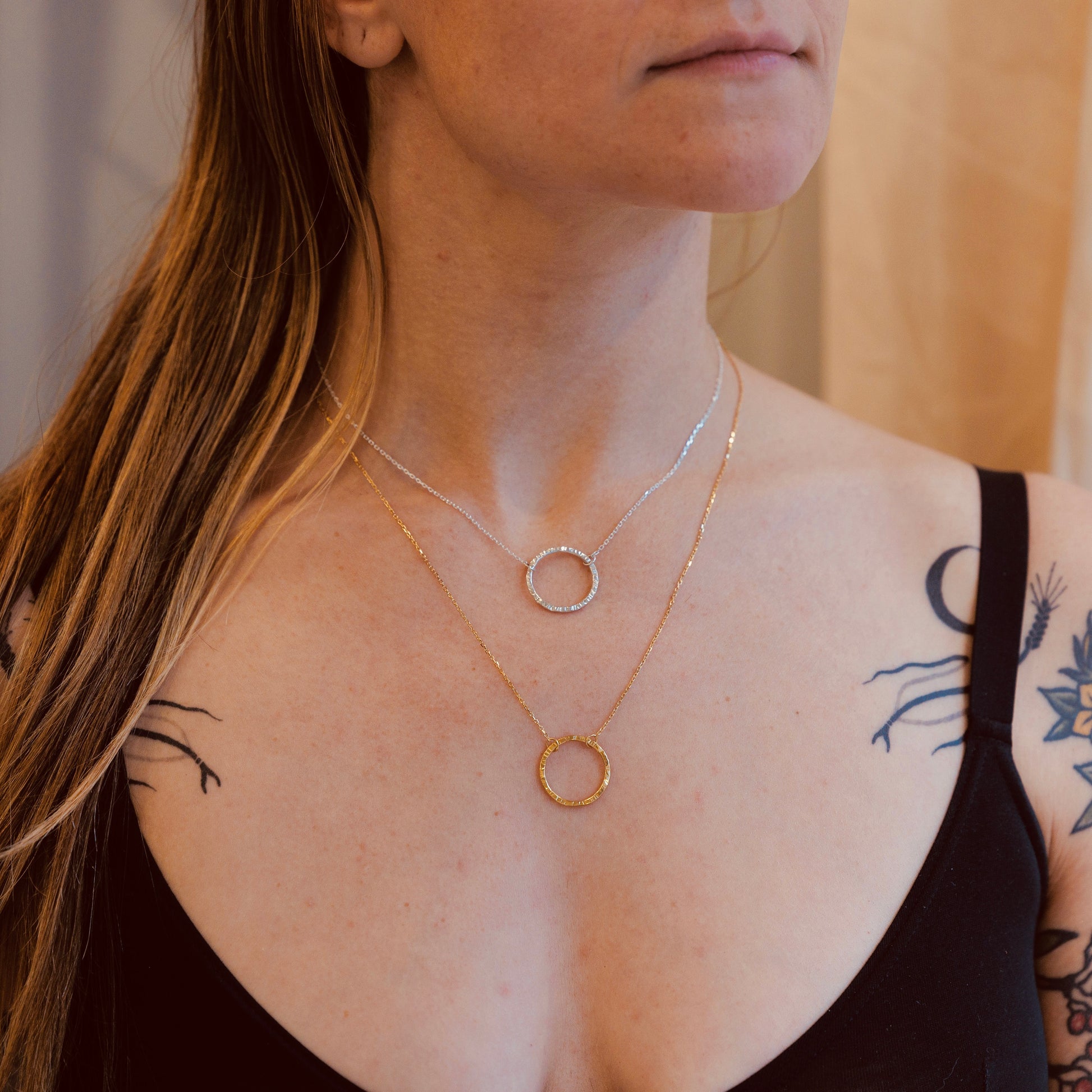 Classic & timeless, this free-hanging textured circle glitters and hangs so beautifully from our delicate sparkly link chain. Best seller for over 20 years.