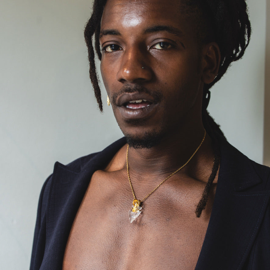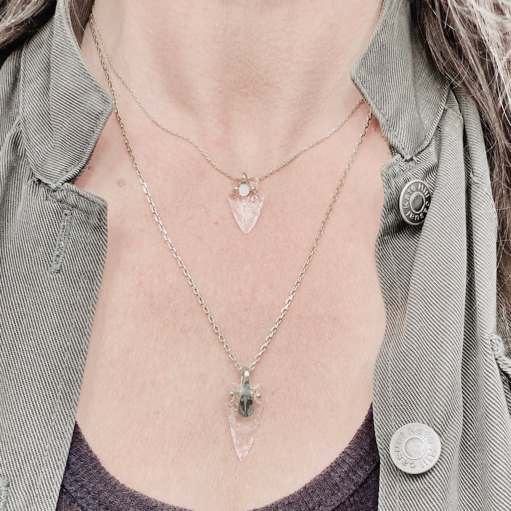 The Quartz Arrowhead is a protection piece. Every Arrowhead is one of a kind and hand knapped by Guardian Wolf, Cherokee, Hiltons, VA. Shana Lee hand-forged each setting individually in her Upstate NY studio.