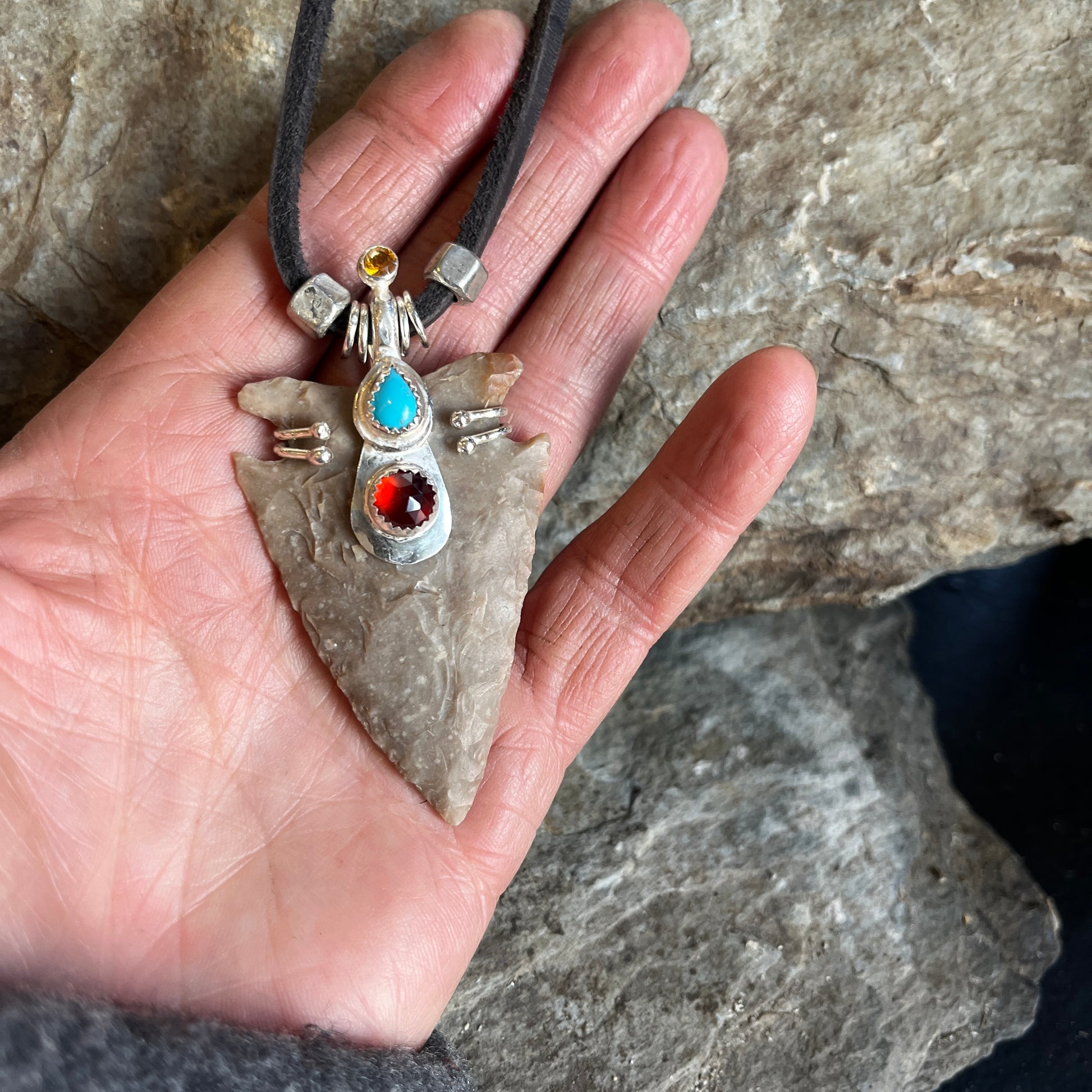 This flint arrowhead is hand-knapped by Guardian Wolf, Cherokee, Hiltons, VA. (Photos of Guardian Wolf working are shown) This specific flint is from Ohio - near the Serpent Mound. Over time the brown color takes on the oils of your skin and we have seen some of this flint (after a year of wearing) start to change color. In some cases designs magically appear in the flint. We do not have much of this flint left - only a few handfuls.