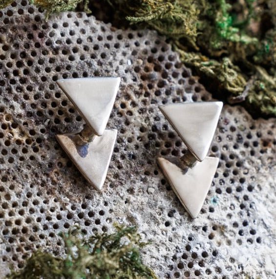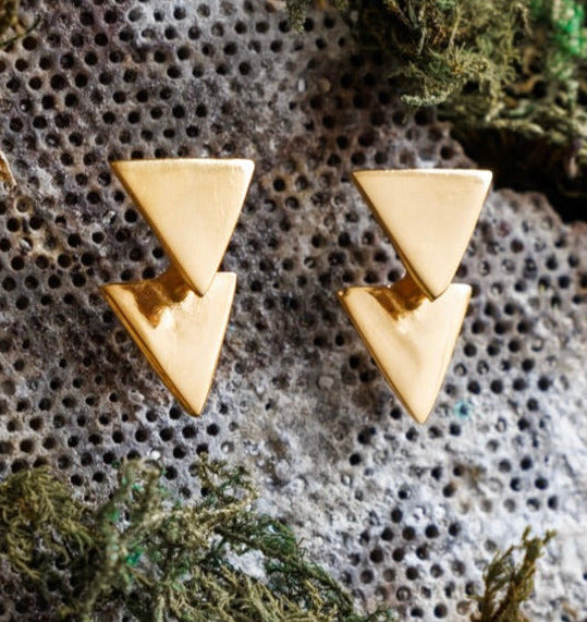 The front triangle sits forward as a usual stud while bottom triangle sit back behind earlobe. A fiery cool geometric stud.