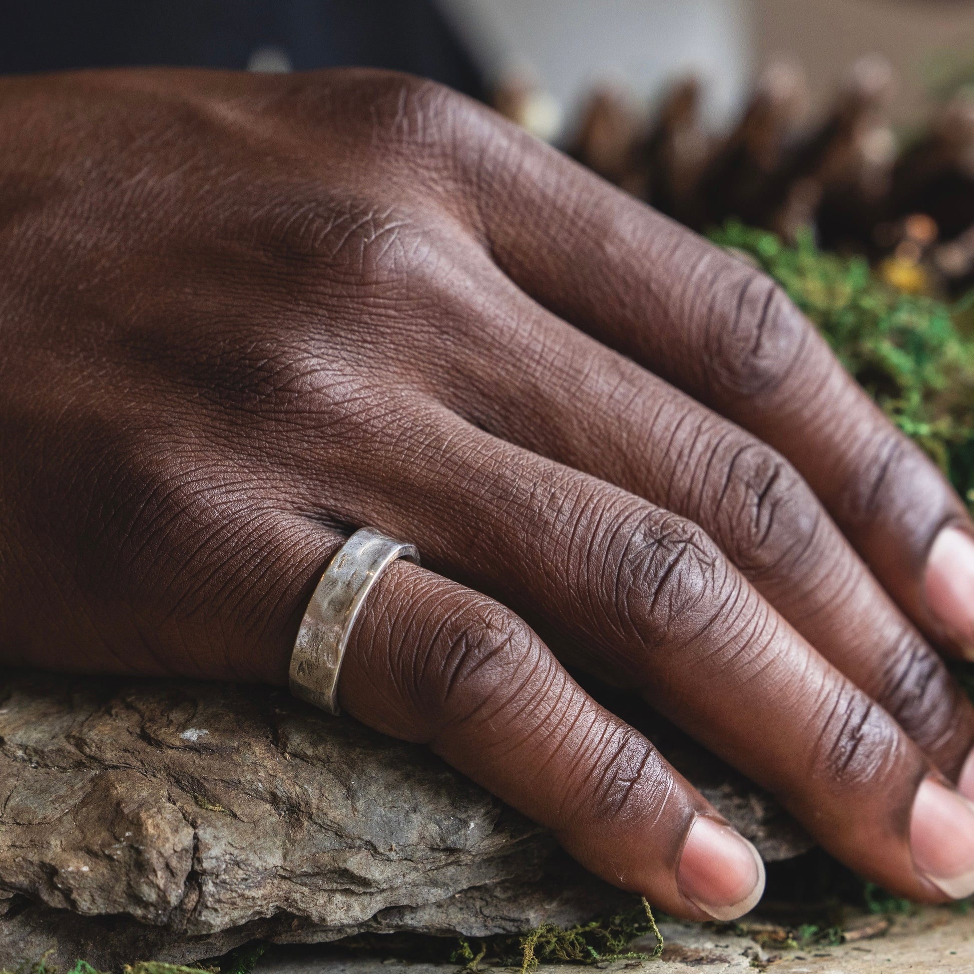 We call this tanner - because this finish reminds us of leather. This understated men's band is masculine, comfortable, and easy-going. This ring is not cast, it is made from wire, hammered, ground, textured, then polished again.