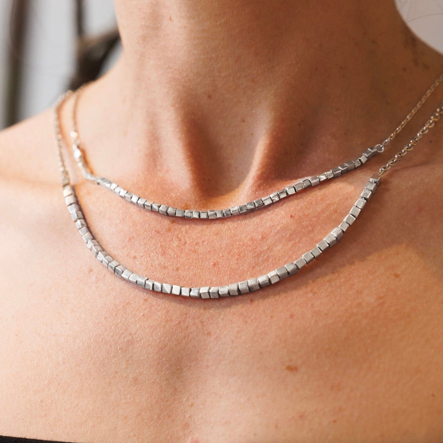 Timeless. The way the square beads shift & rotate is visually stunning. Each bead is cast, then hand polished - yes it is a labor of love.