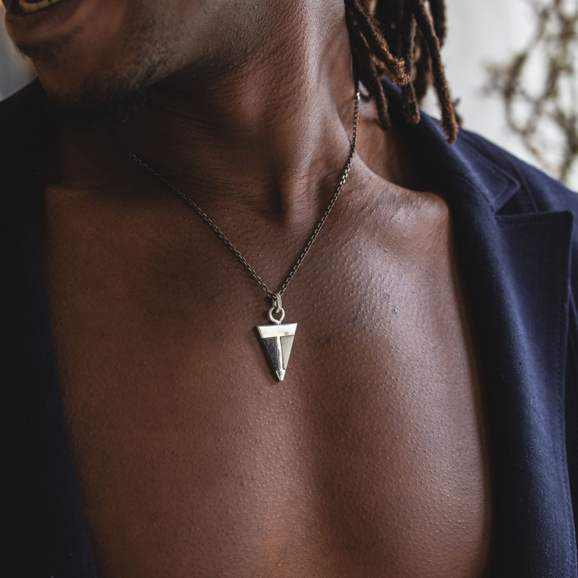 Sterling silver & Sacred Native American stones catlinite (red) and steatite (black) OR deer bone & steatite. The stone & bone are hand cut, carved, sanded and inlayed into the triangle setting. The stone work is by Guardian Wolf & Little Wing, the silver work is by Shana Lee.